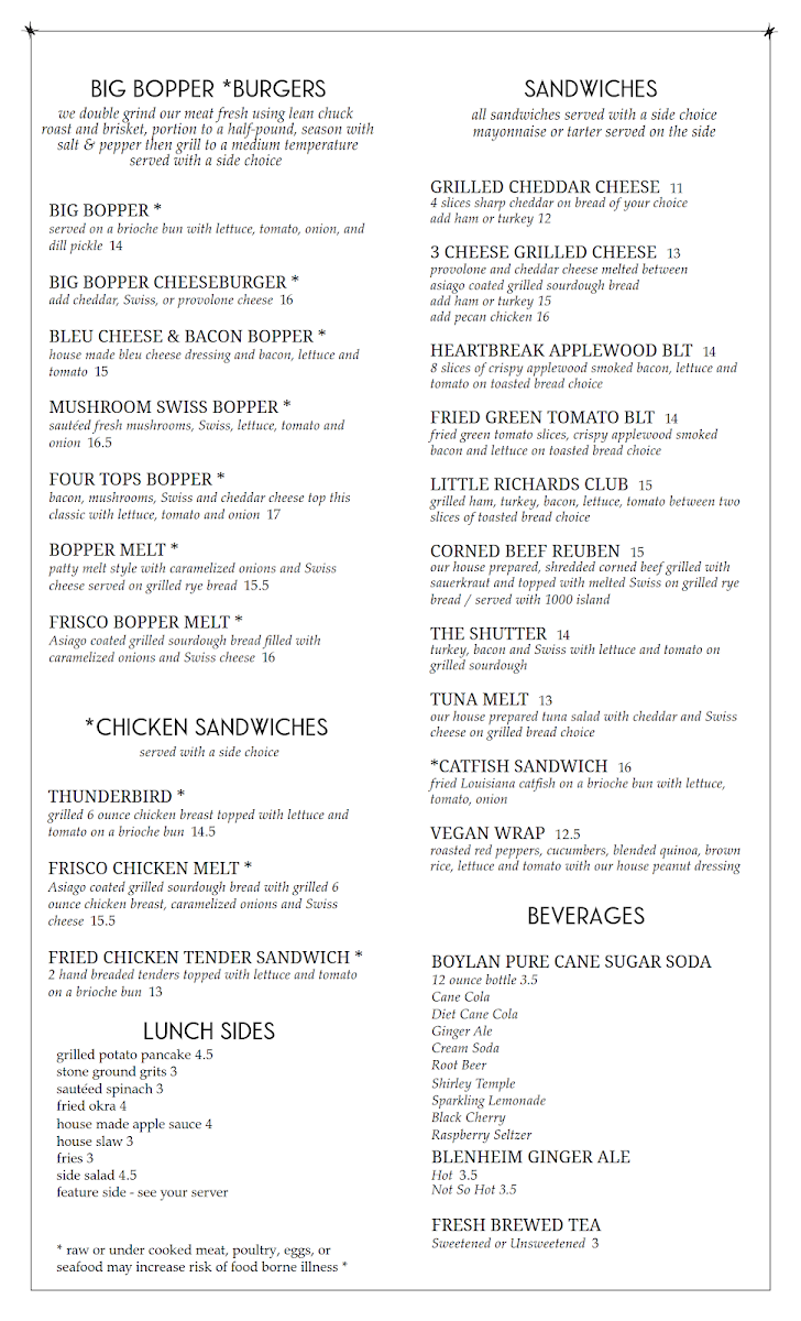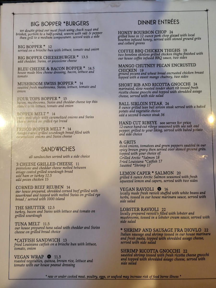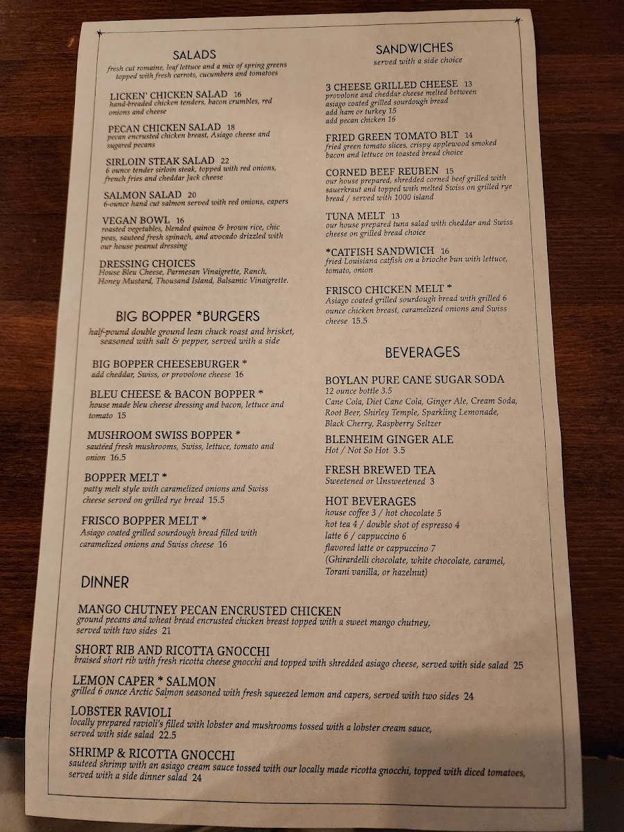 When it comes to hearty entrees, the Big Bopper Burger is a standout. Served on a soft brioche bun and customizable with your choice of cheese, the burger pairs beautifully with a variety of sides, like the crispy Potato Pancake or the fresh Sautéed Spinach, all for a reasonable price of $14.50, or $17.00 with cheese. If you're looking for savory comfort, don't miss out on the Chicken Frisco, featuring a grilled chicken breast kissed with flavors of caramelized onions on a deliciously grilled sourdough bread, priced at just $15.00. Each bite is designed to brighten your palate and warm your soul.